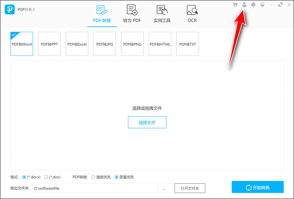 2、运行 “pdf转换王” ,点击界面“账户”按钮,进入登录界面;你可以直接使用微信扫码登录,也可以使用第三方账号(微信/qq/微博等账号)登录。