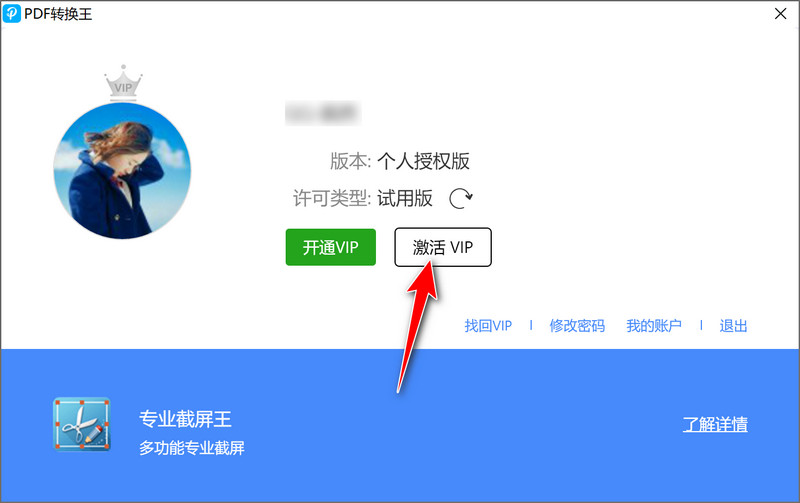 3、登录成功后,再次进入账户页面,点击“激活vip”;